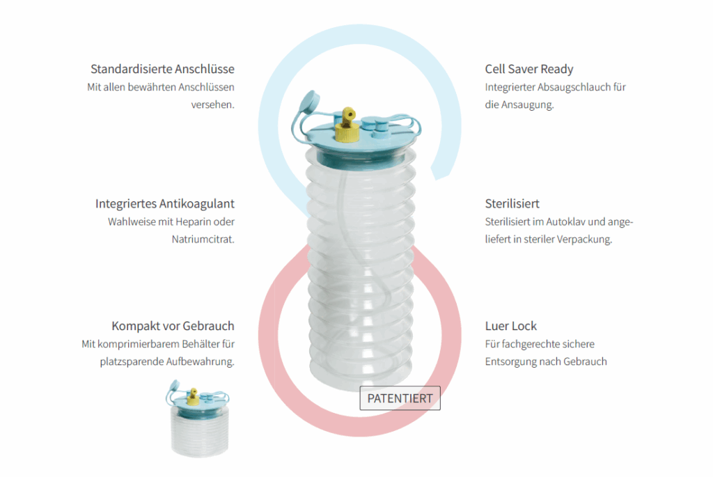 Mit BloodSaver wird das Wundblut in einem sterilen, mit Heparin oder Natriumcitrat vorbehandelten Behälter gesammelt und kann mit Hilfe eines CellSaver jederzeit dem Patienten retransfundiert werden.